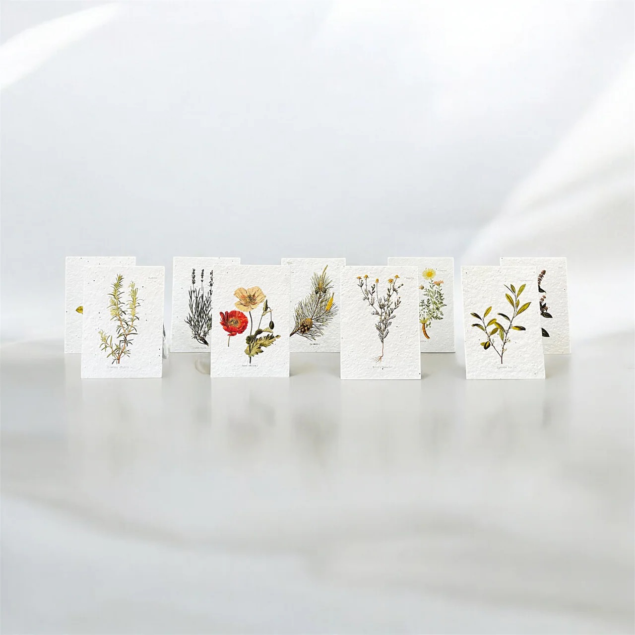 Bring deine Worte zum Blühen mit unseren Postkarten auf Samenpapier. Set mit 10 verschiedenen Illustrationen aus der Pflanzenwelt.